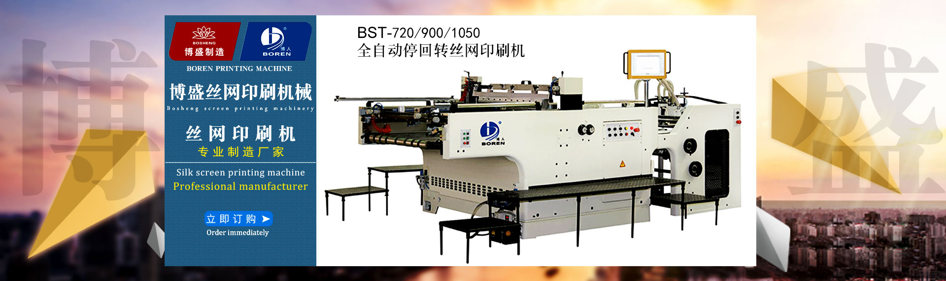 瑞安市博盛絲網(wǎng)印刷機(jī)械廠是一家專(zhuān)業(yè)集生產(chǎn)加工,經(jīng)營(yíng)批發(fā)的私營(yíng)獨(dú)資企業(yè)。制造各類(lèi)全自動(dòng)絲網(wǎng)印刷機(jī)、卷對(duì)卷全自動(dòng)(無(wú)紡布)網(wǎng)印機(jī)、全自動(dòng)卷筒式網(wǎng)印橫切一體機(jī)、半自動(dòng)平升式、斜臂式微電腦控制精密網(wǎng)印機(jī)、紫外線(UV)光固機(jī)、絲印真空曬版機(jī)、烘版機(jī)、熱風(fēng)烤(烘)箱、組合式(IR)紅外線烘道、機(jī)械式精密... 查看詳情>>